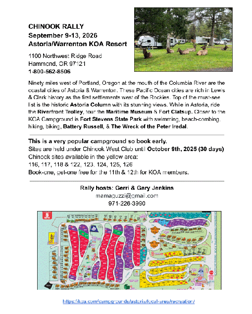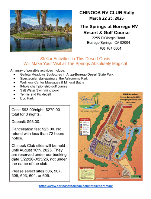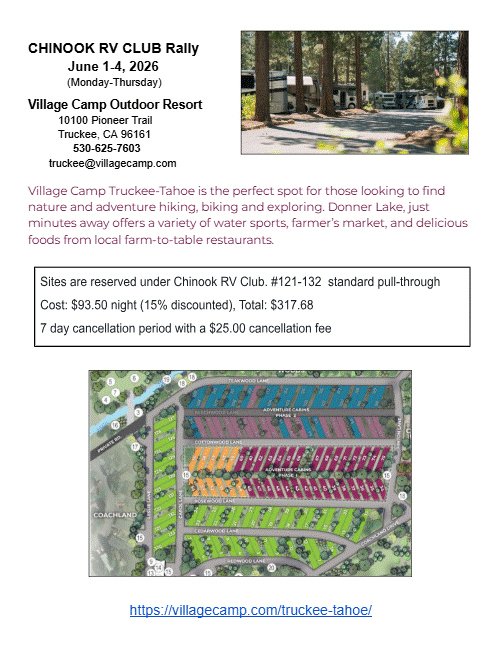 This fantastic resort is situated in Santa Barbara, where the Pacific Ocean and Ynez Mountains offer a spectacular setting and stunning backdrop for activities and adventure. You can enjoy fun amenities like a heated swimming pool, our amazing market that features camping & beach gear, souvenirs, local wine, and craft beer. Gather for our seasonal outdoor movie nights on the market lawn or explore trails on docent-led hikes. The Chinook Club has reserved sites for 4 nights for a total cost of $391.20 which includes the nightly rate, a resort fee, a Military Discount, and a special Managers Discount. Sites still available: 844, 846, 847, 848, 849, & 874. Please call the RV Park at 805-879-5751 and reserve one under Mary-Esther Chaverela/Chinook Club. Possible Chinook group activities include a tour of Old Mission Santa Barbara, wine tasting, and a city tour of Santa Barbara. Hope to see you there!